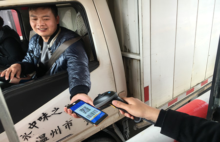 “嘀!”扫码成功!台州高速台州收费所出口车道,黄师傅掏出手机打开支付宝APP,选择首页“付款”,手机对准安装在收费窗口外侧的扫码设备,成功支付通行费,随即拿到通行发票,车道栏杆自动抬杆放行。扫码缴费出站仅用了几秒种。这是台州高速公路支付宝移动支付通行费第一辆车。“今天真是运气,正好没带现金,没想到高速也可以支付宝支付通行费了!”黄师傅赞叹道,“现在出门就带手机,以前有次忘带钱包,结果到了出口才想起来,于是车子里到处找零钱。太尴尬了。”