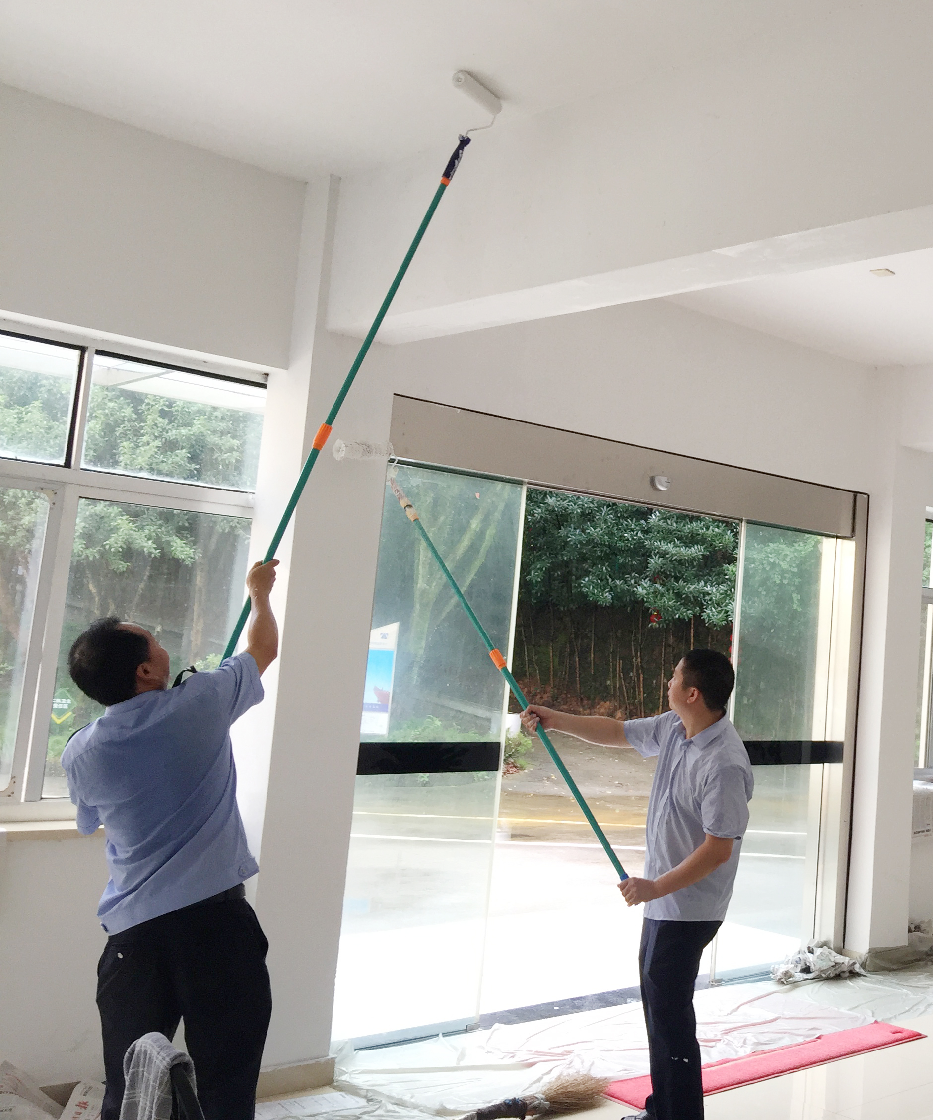 图为“粉刷匠”粉刷现场 现场,工具备齐后,大家捋起袖子开始动工。家里正在装修的林通,有着丰富的粉刷经验,指导大家如何将墙体粉刷得平整又美观。分工明确后,有的拿起粉刷棒,有的搅拌涂料,有的铺垫报纸及塑料纸,有的清理刷墙后残留在地面的垃圾。整个劳动过程中,各个动作麻利,干劲十足。粉刷是个技术活,更是个力气活,只见浸满涂料的刷子在墙上挥舞着,个个汗如雨下,却都顾不得休息,在大家的齐心协力下,原本一片灰不溜湫的墙壁变得雪白光洁。 这次义务劳动,不仅美化了站所环境,营造出廉洁的工作氛围,增强了员工的凝聚力和向心力,更增加了全体员工对公司的一份热爱。 林玲
