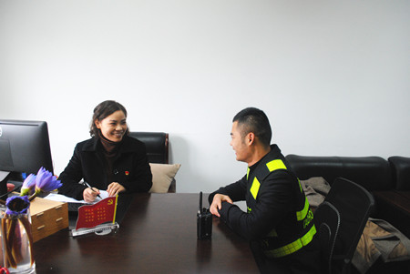 图为台州收费所所长助理牟妲与二班班长马德侦谈心