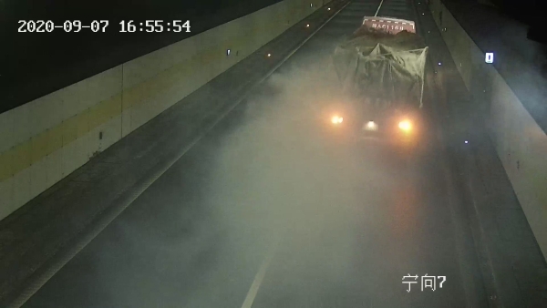 9月7日下午16点53分,一辆大货车驶入宁向黄土岭隧道,打着双闪灯,整车发散出浓浓的烟雾,造成隧道内能见度极低。