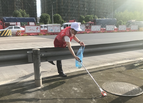 图为工作人员向过往司乘发放垃圾不落地宣传单
