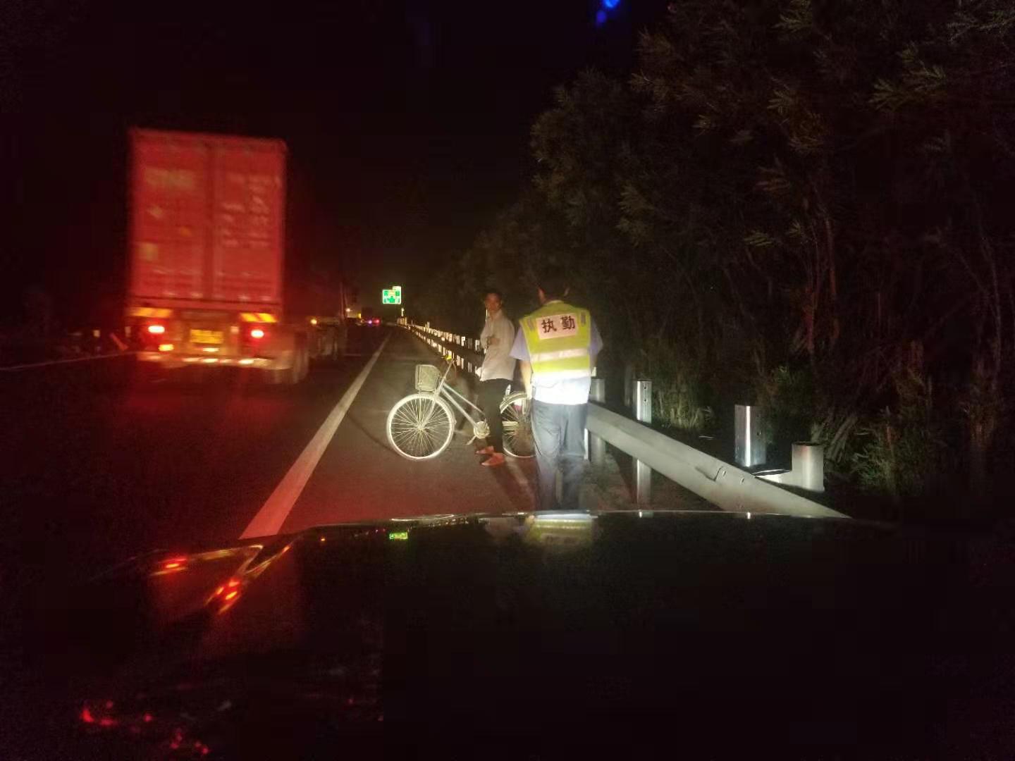 图为执勤队发现骑车人 9月24日21:09分,大溪岭隧道所中控室发出通知。执勤队员接中控指令,迅速出警。晚上九点,在高速公路上找人,需得打上12分的精神,巡逻车放慢车速,坐于后座的队员们紧盯着车道两旁,终于在21:14分,距离宁向隧道出口一公里处发现该骑车男子,队员们立即上前将其拦住。眼前的一幕令执勤队员吓出一身冷汗,该男子左手残疾,单手骑车,晚上视线模糊,且高速公路上车多,速度快,司机很难发现有行人,如发现蹿出来的行人而采取紧急制动,会造成多起追尾事故,现场情况非常危险!队员们合力将自行车抬上车。