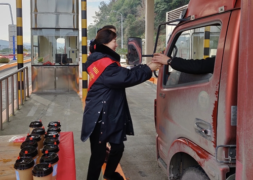 活动当天,虽然气温较低,但是在临海南收费所入口处,身着红色绶带的志愿者们依然热情地为过往司乘人员递上一杯杯滚烫的姜茶,并向过往大货车驾驶员发放优惠政策宣传单。